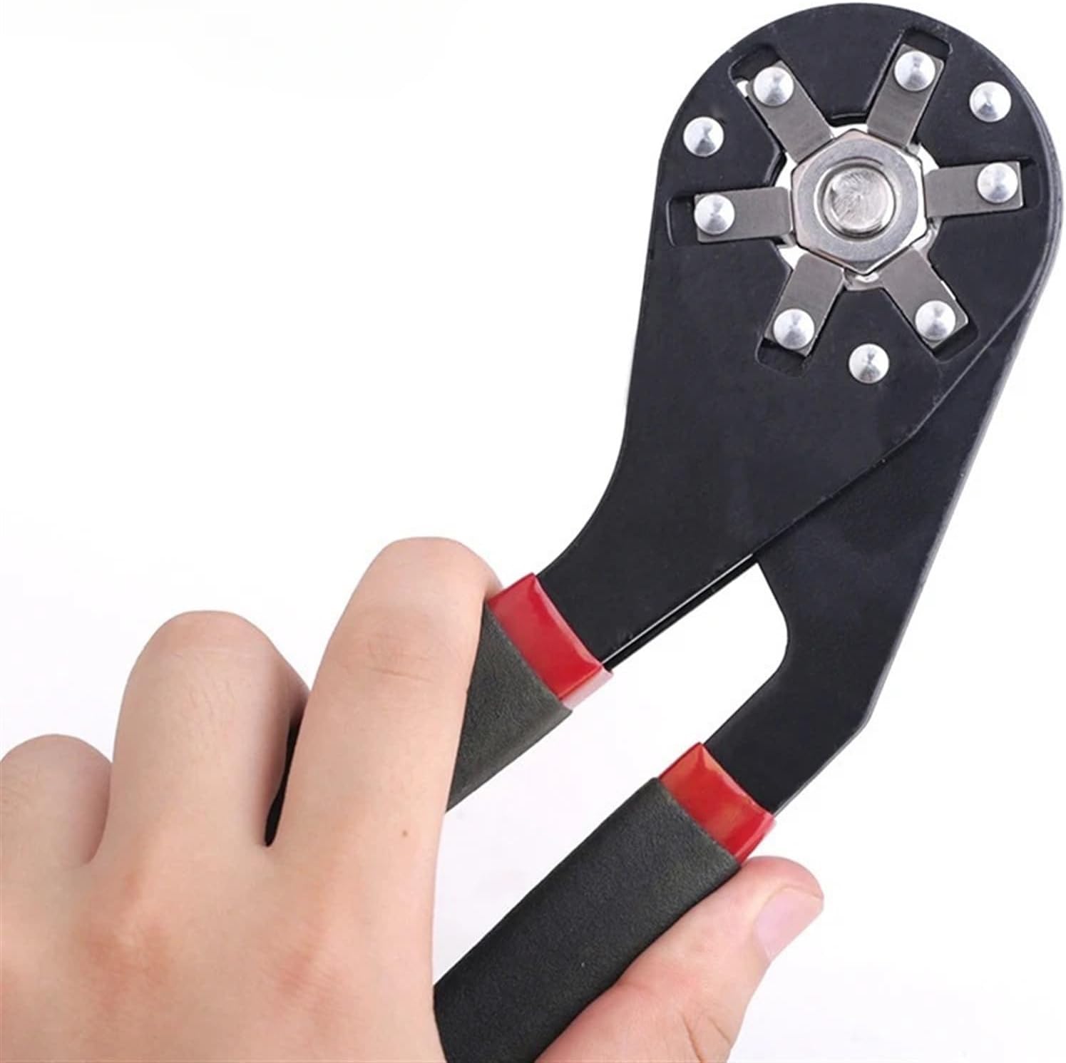 La llave hexagonal mágica es una herramienta manual diseñada para proporcionar un ajuste preciso y cómodo en una variedad de superficies roscadas. Su diseño ergonómico con mangos recubiertos de material antideslizante asegura un agarre seguro, mientras que su cabeza circular equipada con placas metálicas permite una adaptación flexible a diferentes tamaños de tuercas.